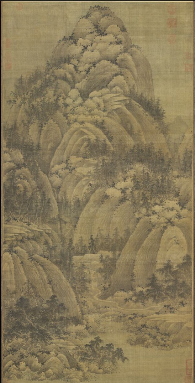 巨然是宋初开元寺的画僧,工画山水,师法董源,以长披麻皴写山,晚年渐趋平淡,北宋沈括有:“江南董源僧巨然,淡墨轻岚为一体”之说,其:“笔墨秀润,善为烟岚气象,山川高旷之景”(郭若虚《图画见闻志》),其画在虚灵、幽僻、清远之中已将禅意显露无疑。《层崖丛树图》、《秋山问道图》、《烟浮小景》等都给人以虚静、幽远,同时又亲切平易的感受。